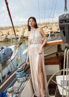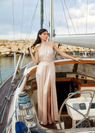 שמלת ערב באורך מקסי. חלק עליון מוצלב עם סגירת קולר וגב חשוף. שסע צידי עמוק. מבד לורקס מבריק ונשפך. מידה S מתאים למידות 32-34 מידה M מתאים למידות 36-38 מידה L מתאים למידות 40-42 מידות הדוגמנית: מידה 34 – לובשת מידה S