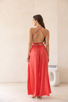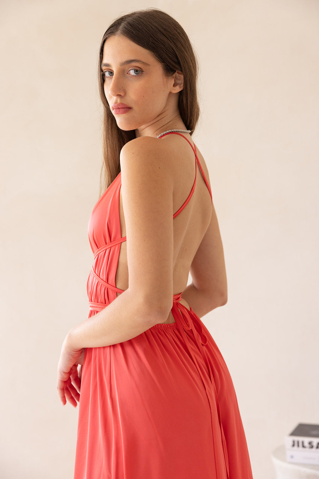 מפתח וי עמוק בגזרת משולשים, גומי במותן וגב חשוף עם קשירת איקס.