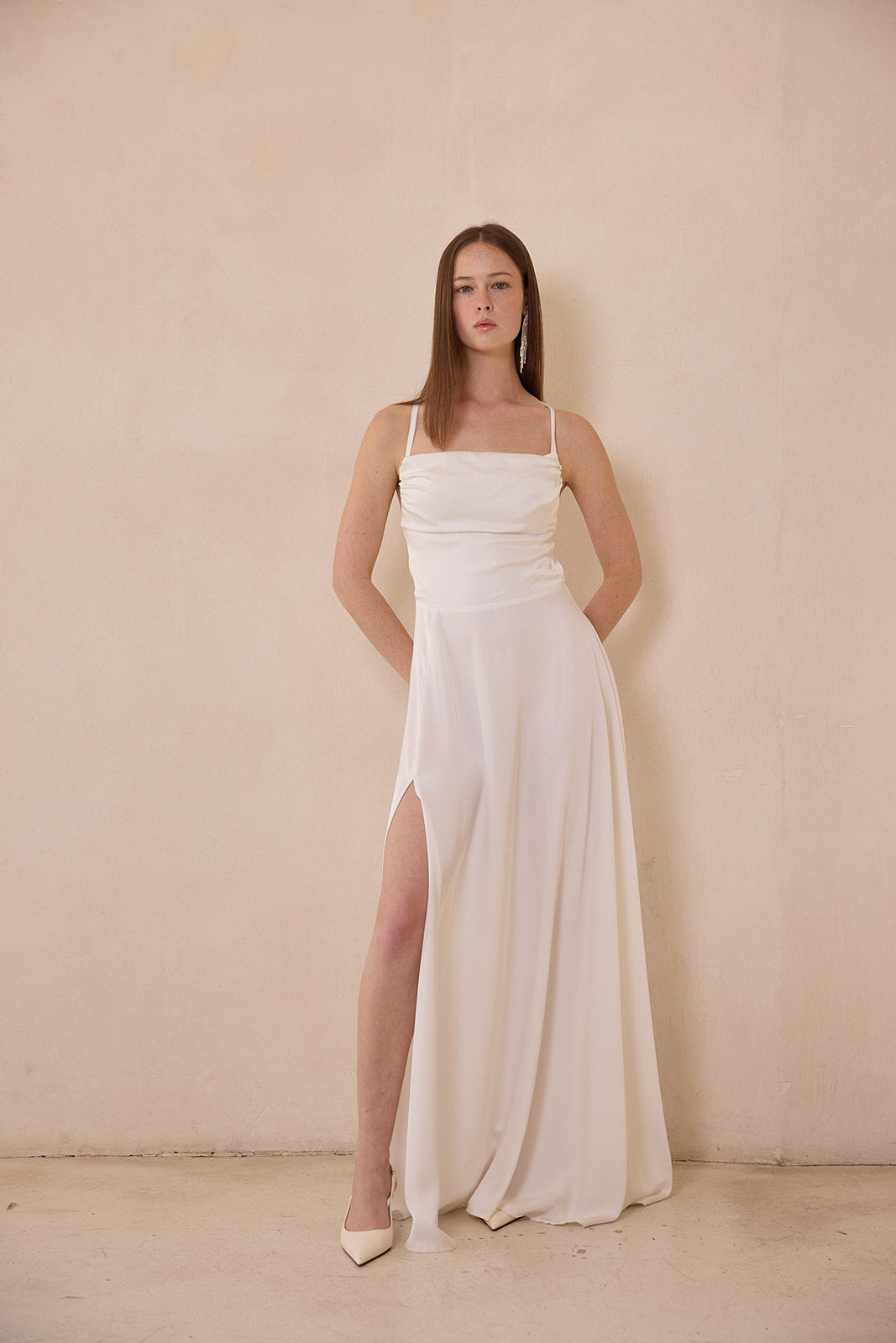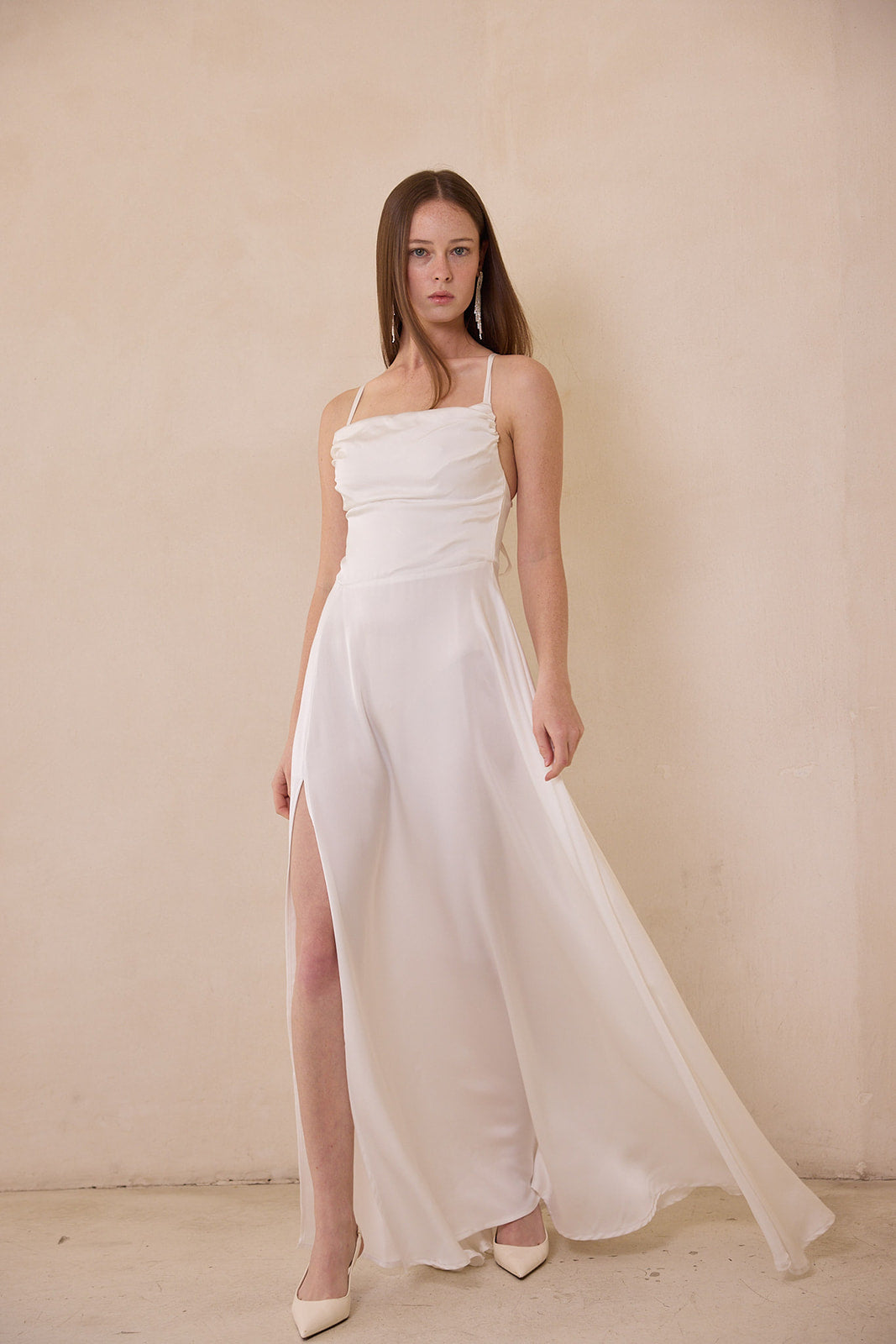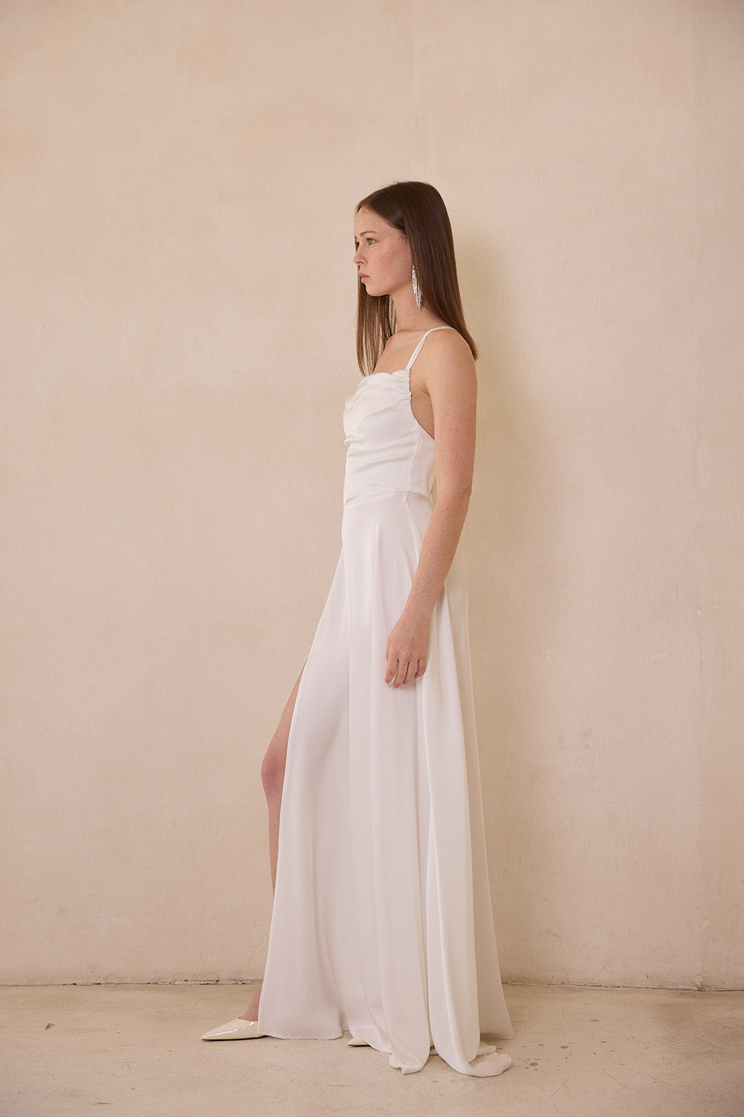 שמלת ערב מבד סאטן דמוי משי רך, נשפך ובעל ברק עדין.
