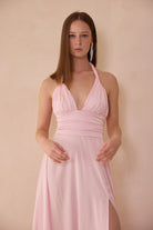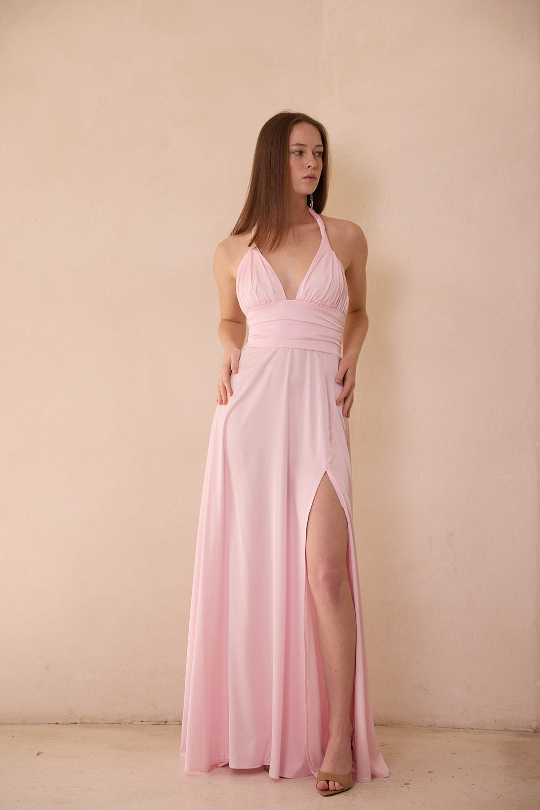 גב חשוף, גומי במותן וחצאית עשירה בבד עם שסע קדמי.
