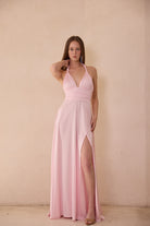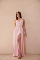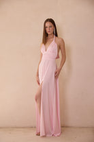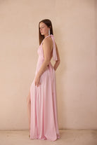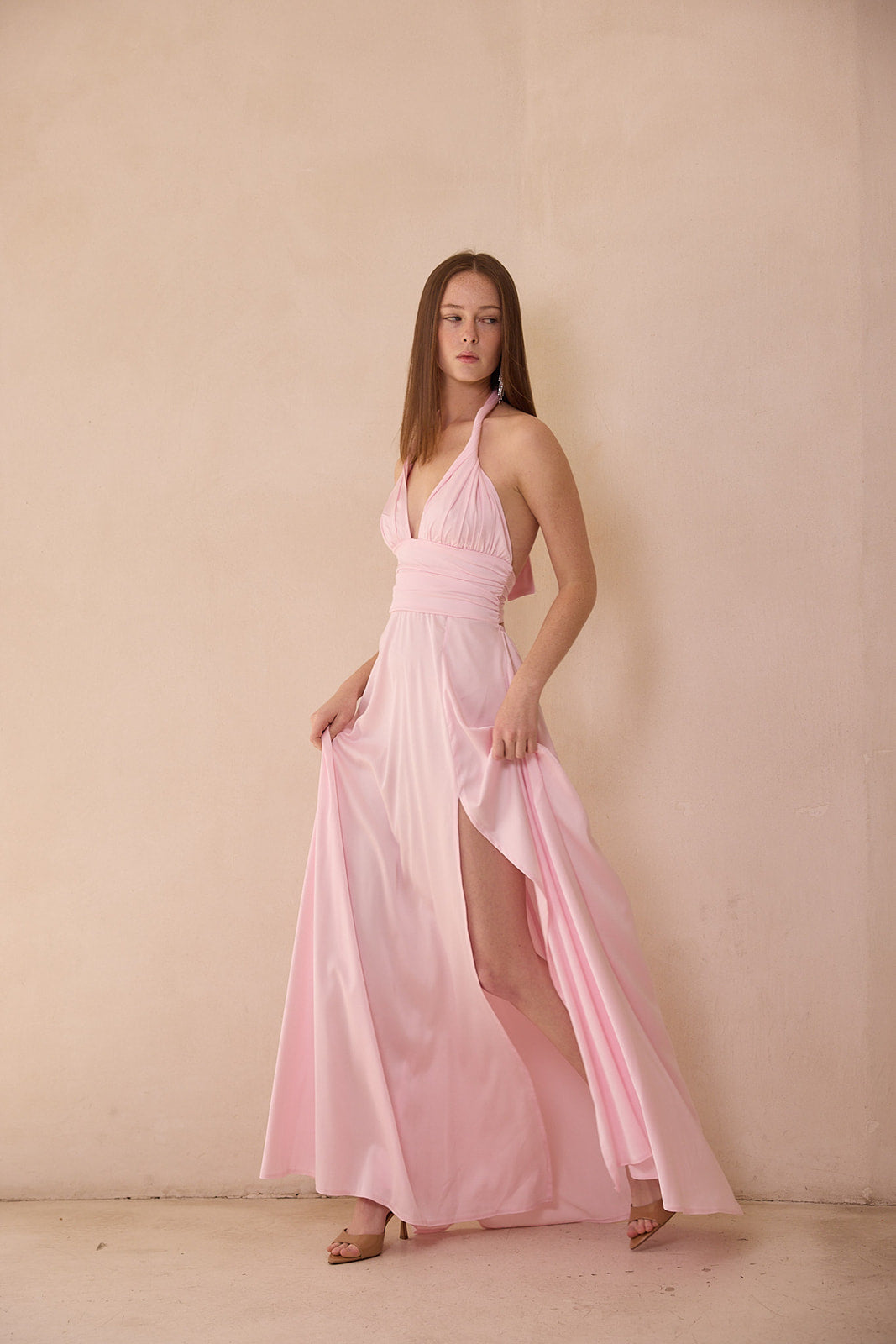 שמלת ערב באורך מקסי מבד סאטן דמוי משי רך ונשפך.