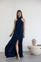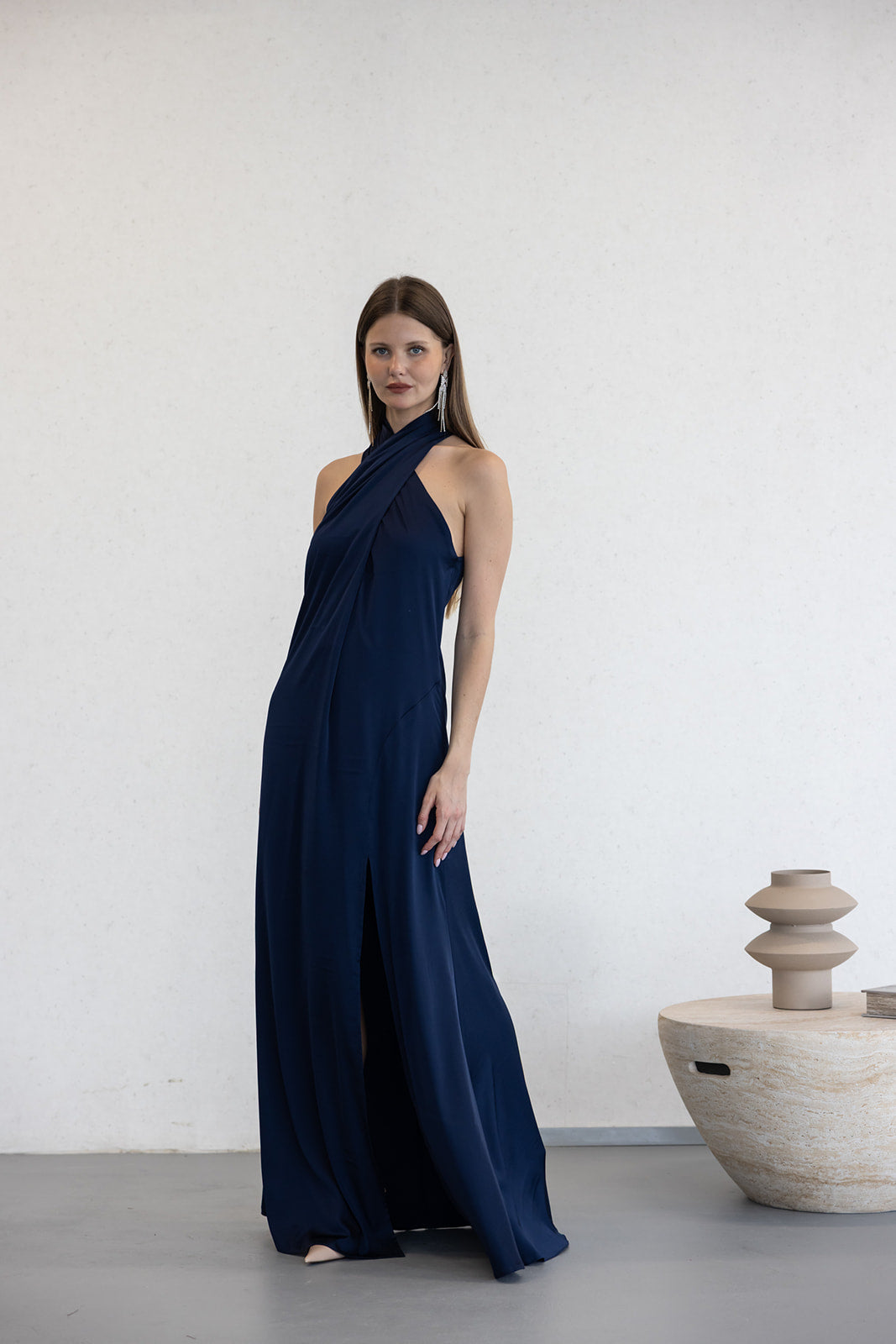 שמלת ערב מרשימה בגזרת קולר עם גב סגור באורך מקסי, עשויה מבד דמוי משי רך ונעים.