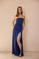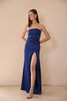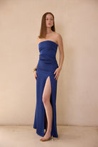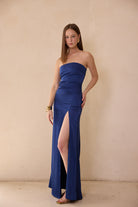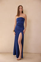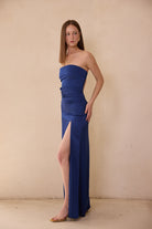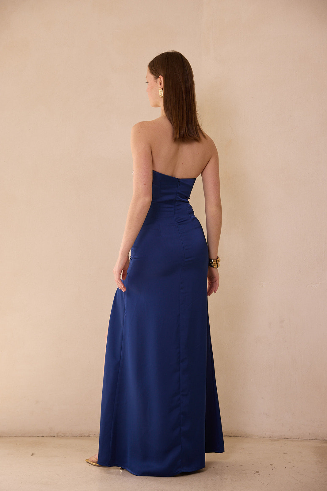שמלת ערב מקסי בגזרת סטרפלס מבד סאטן רך ונשפך בעל ברק עדין.