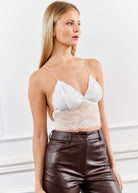 טופ חזיית תחרה עם ביטנה בגזרת משולשים. מידה S מתאים למידות  34-36 מידה M מתאים למידות 38-40 מידה L מתאים למידות  42-44 מידות הדוגמנית: תמר היקף חזה- 78 ס”מ היקף מותן- 63 ס”מ היקף ירכיים- 92 ס”מ גובה 1.70, מידה 34– לובשת מידה S