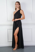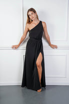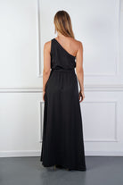שמלת מקסי כתף אחת מבד אריג נשפך וקליל. גומי במותן וחגורת קשירה רחבה. מידה S מתאים למידות  32-34 מידה M מתאים למידות 36-38 מידה L מתאים למידות  40-42 מידה XL מתאים למידות42-44
