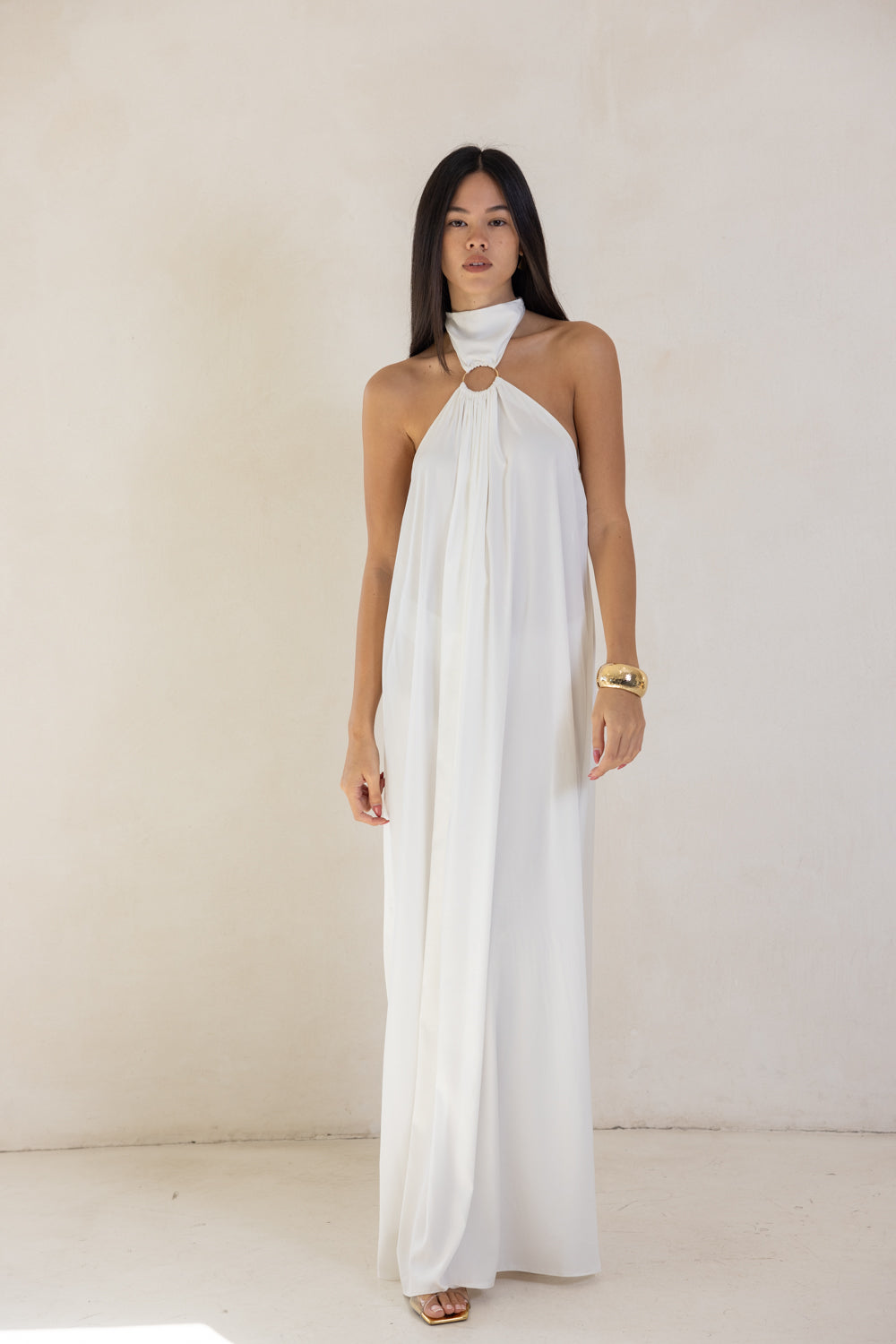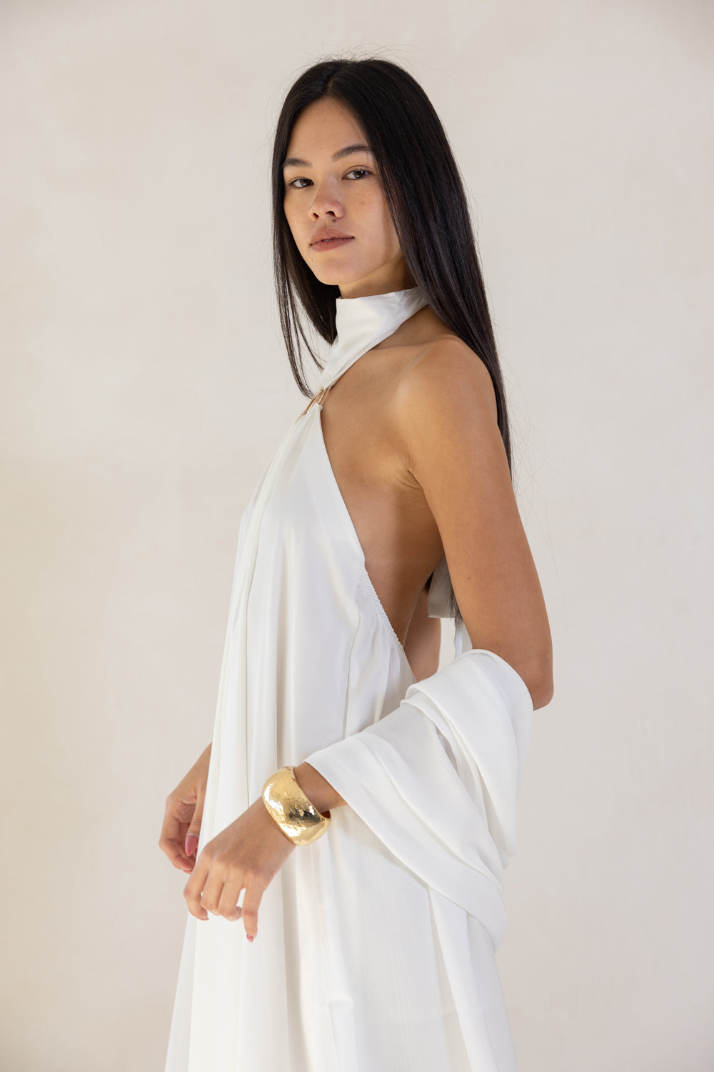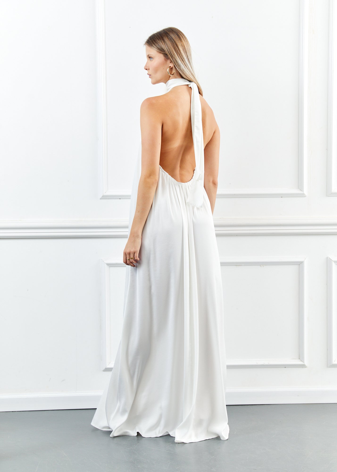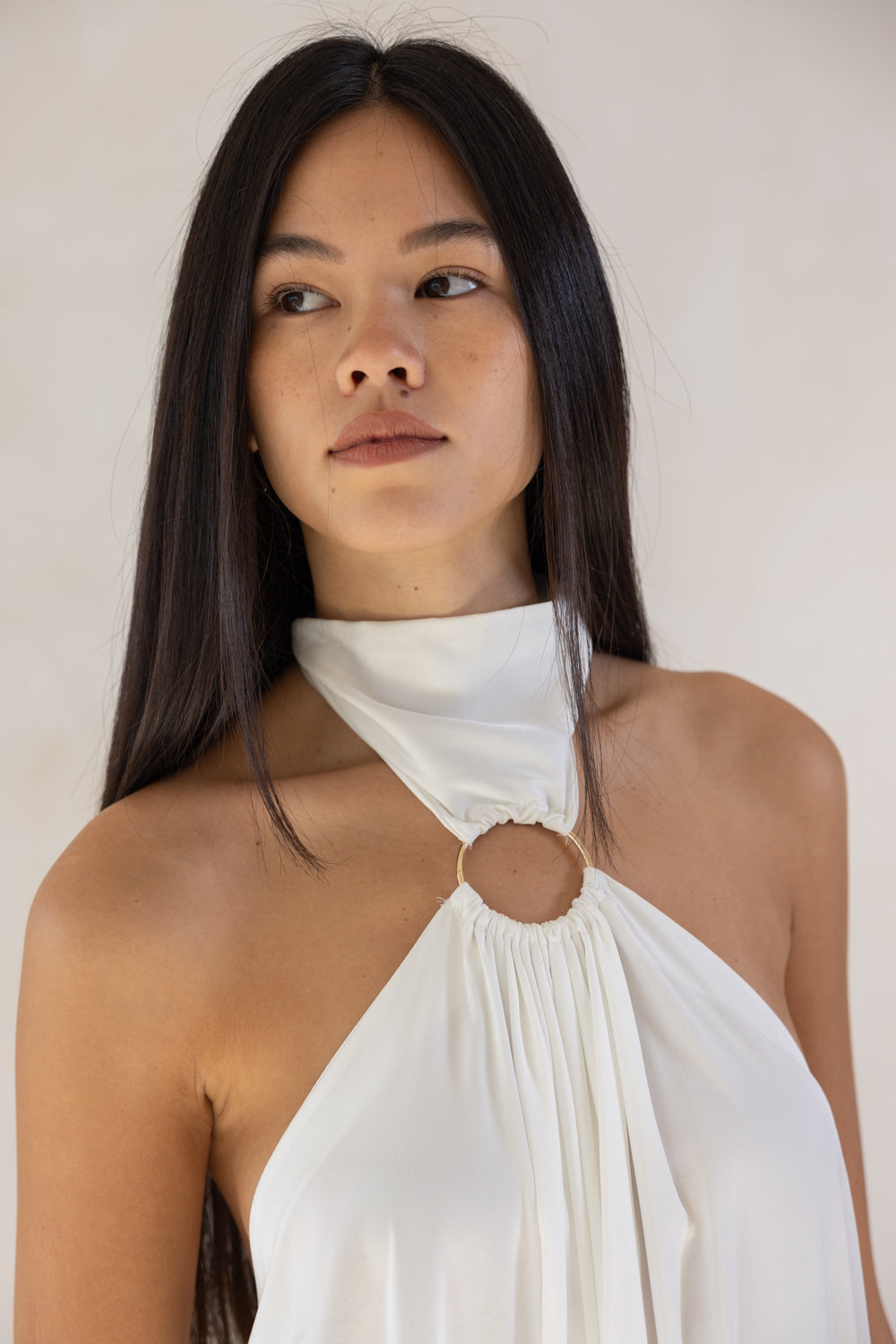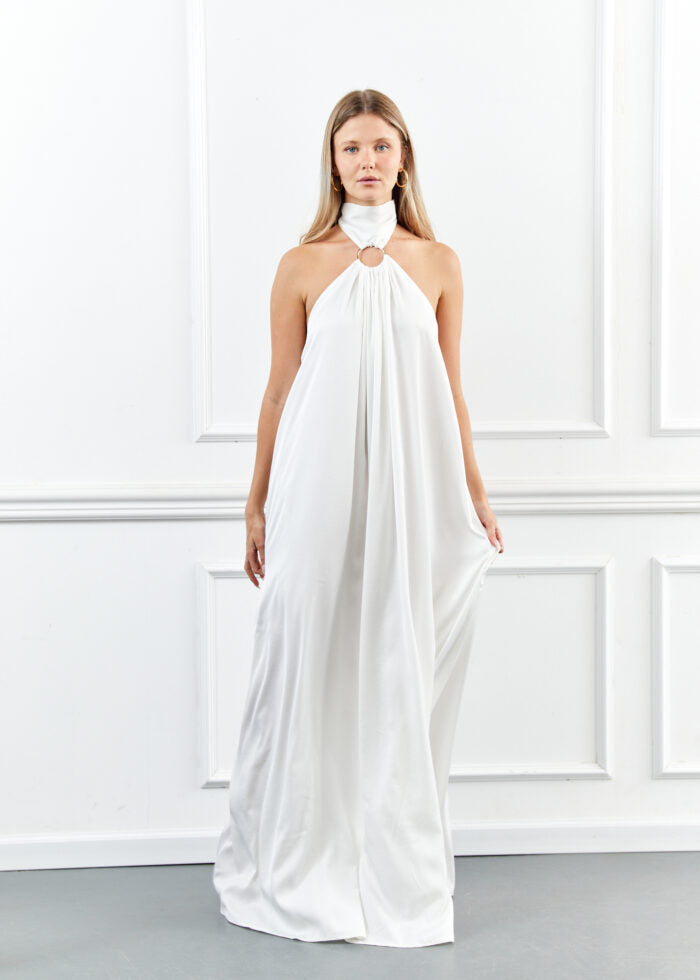 עם אלמנט חישוק שמחובר לצווארון בגזרת קולר, מחשוף גב עמוק.