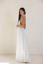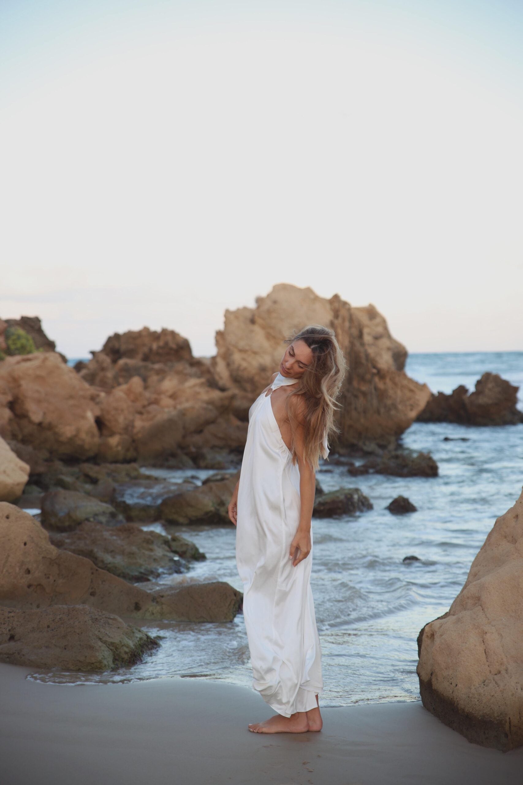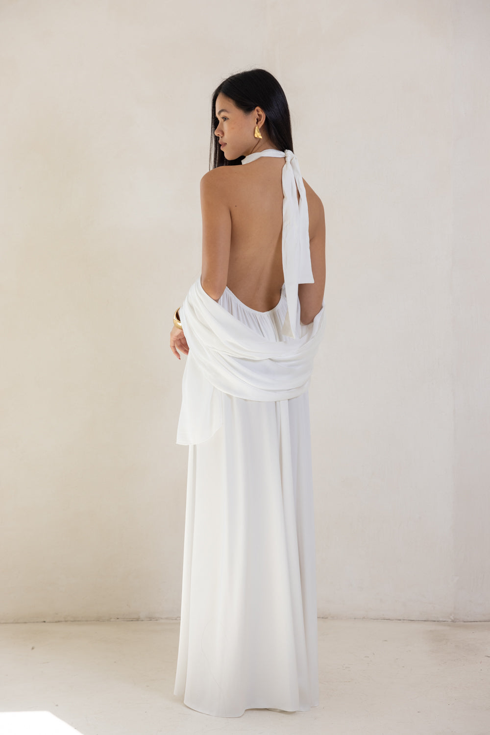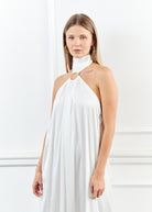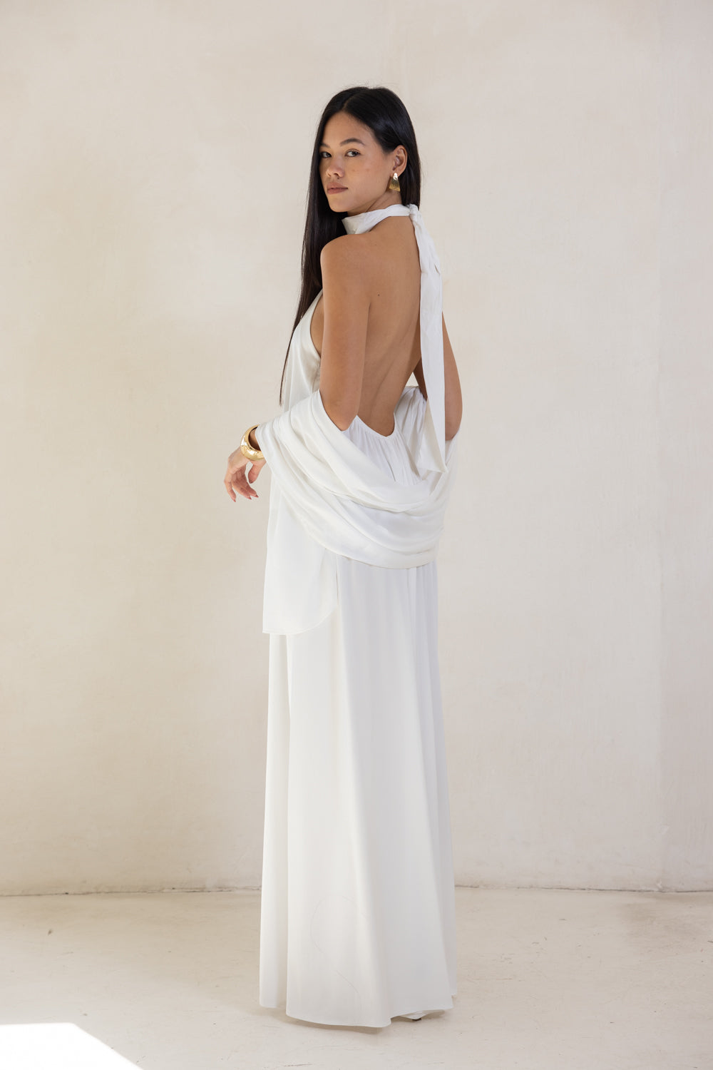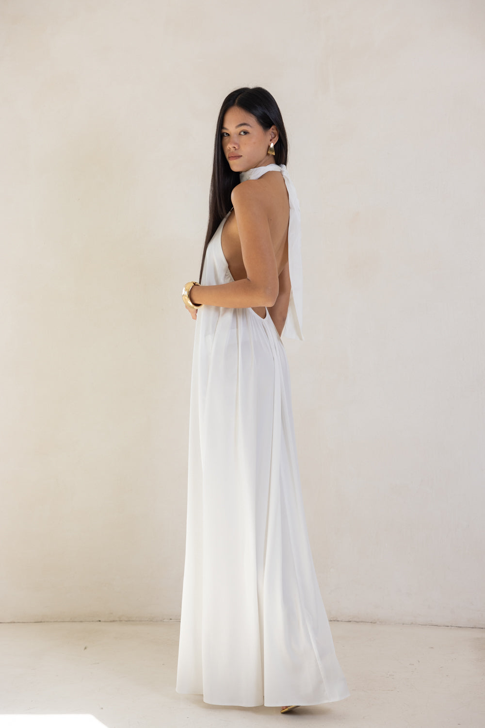 עם אלמנט חישוק שמחובר לצווארון בגזרת קולר, מחשוף גב עמוק.