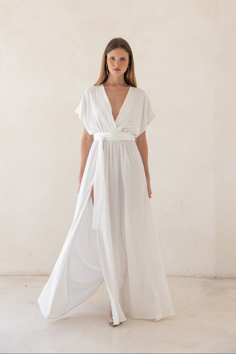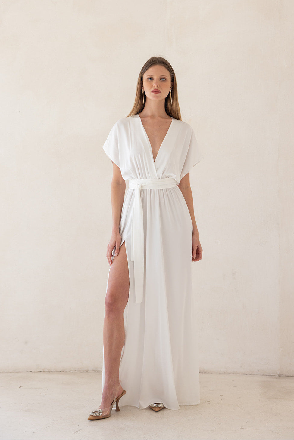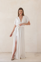 שמלת מערב באורך מקסי עם מפתח וי מעטפת ושרוולים.