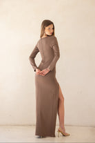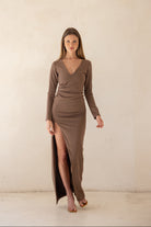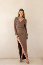 שמלת ערב באורך מקסי בגזרה צמודה ומחטבת, עם מפתח וי ושרוולים ארוכים, מדגישה את המותן ושסע רגל עמוק.