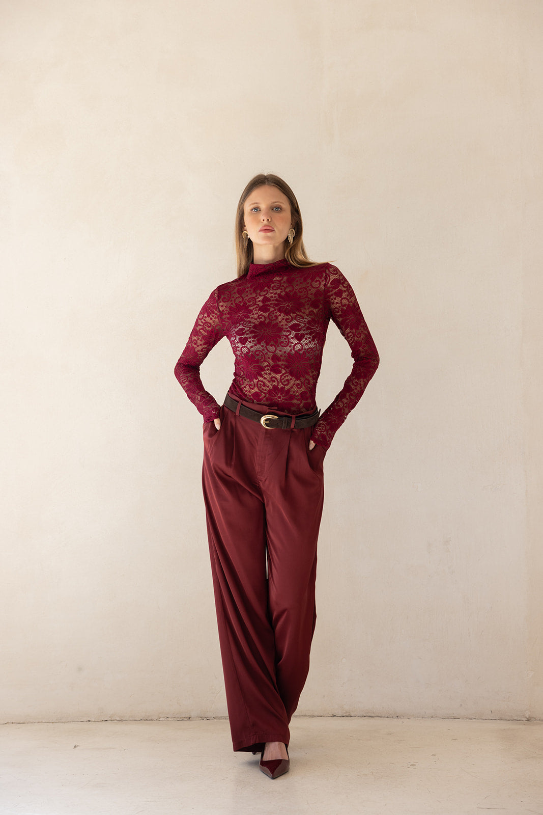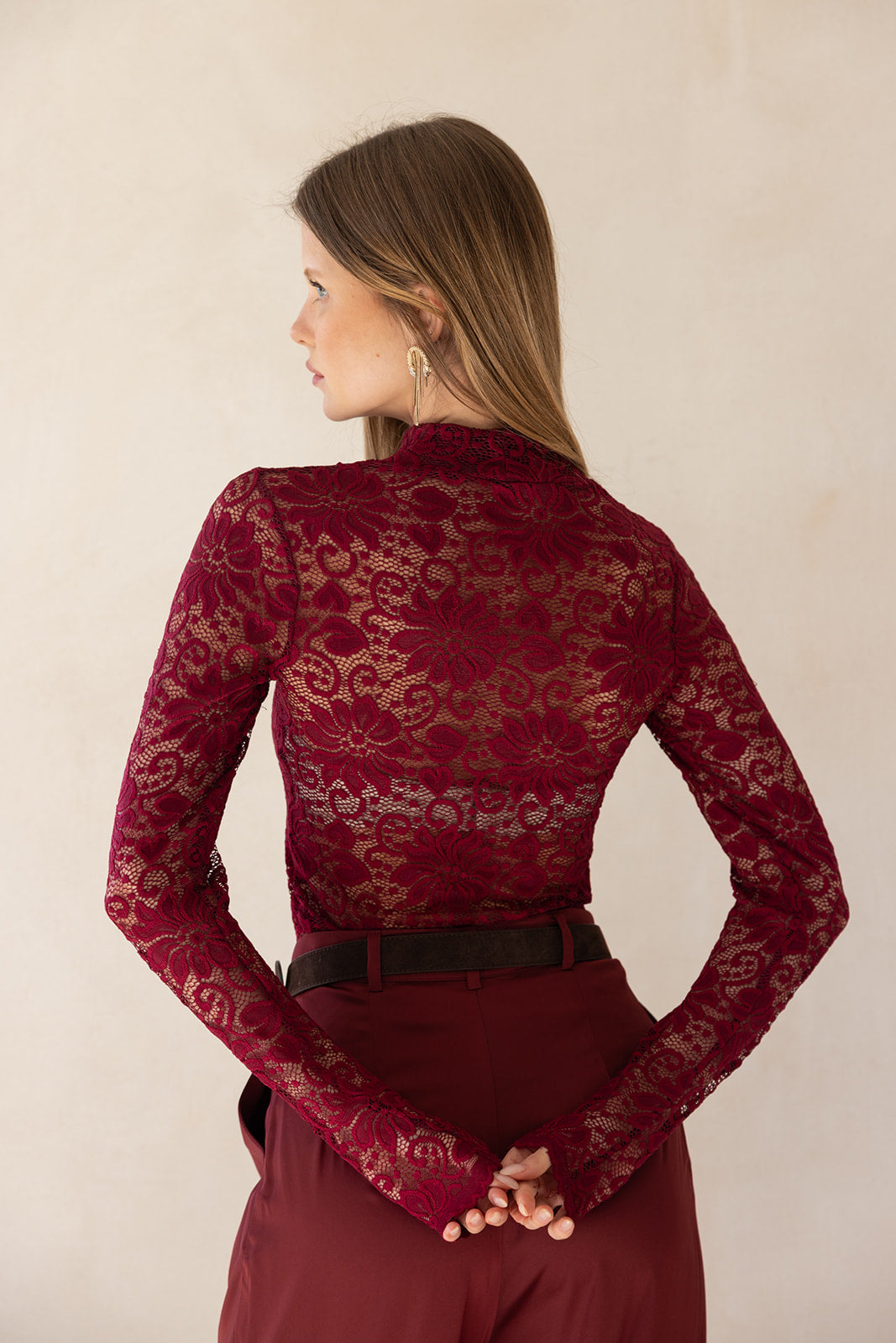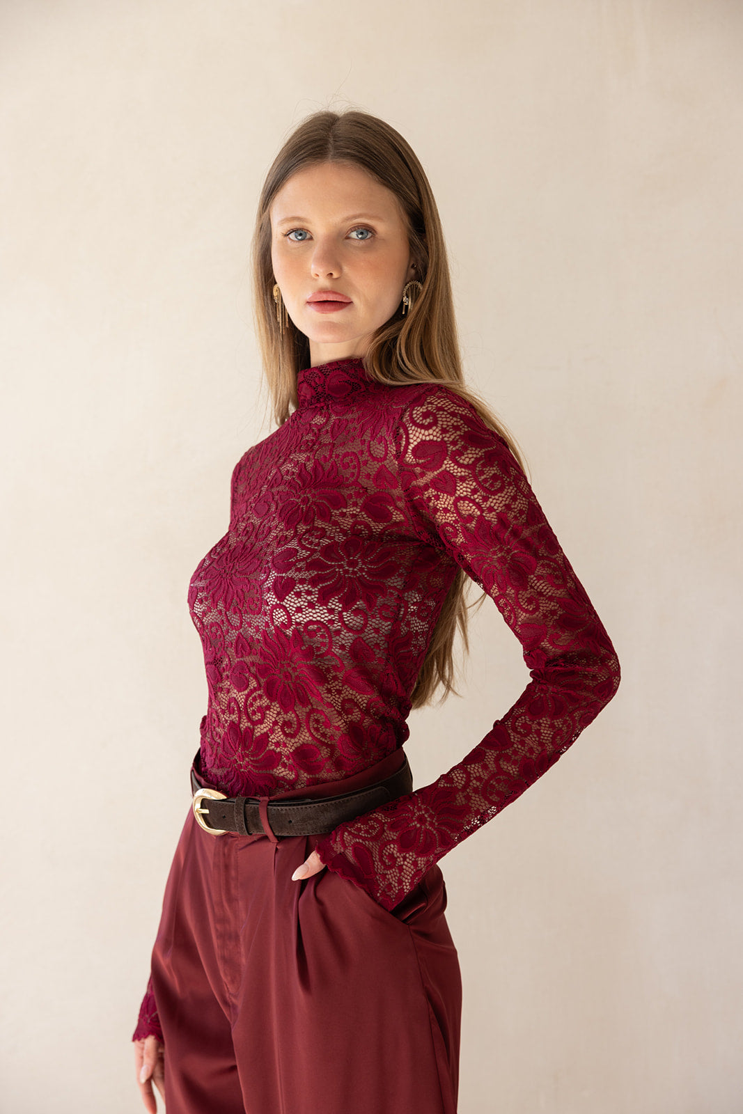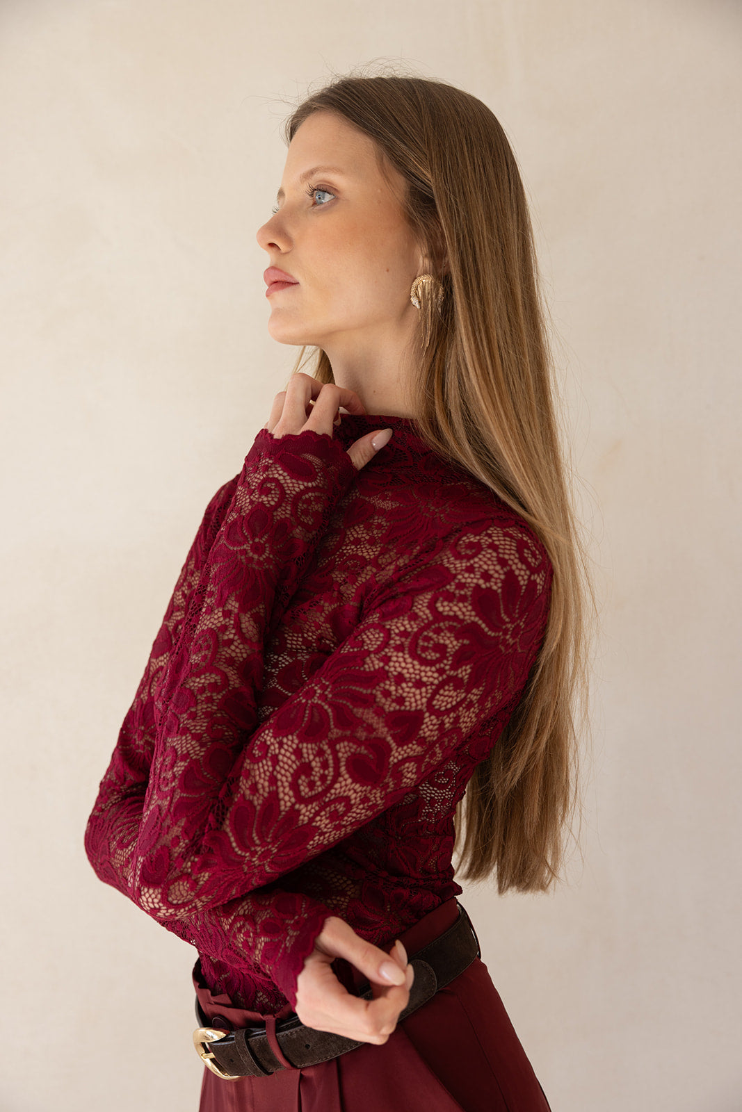 חולצת ערב בגזרת גולף צמודה עם שרוולים ארוכים, המשלבת טקסטורה פרחונית עשירה ושקיפות מעודנת. מבד תחרה איכותי וגמיש, רך ונעים למגע, המעניק מראה ויוקרתי.