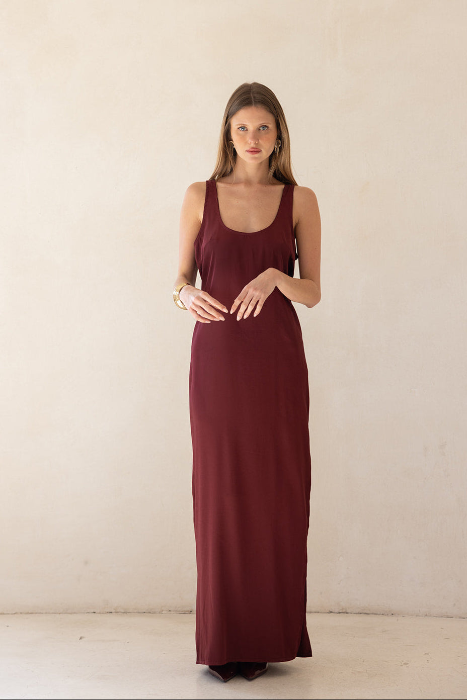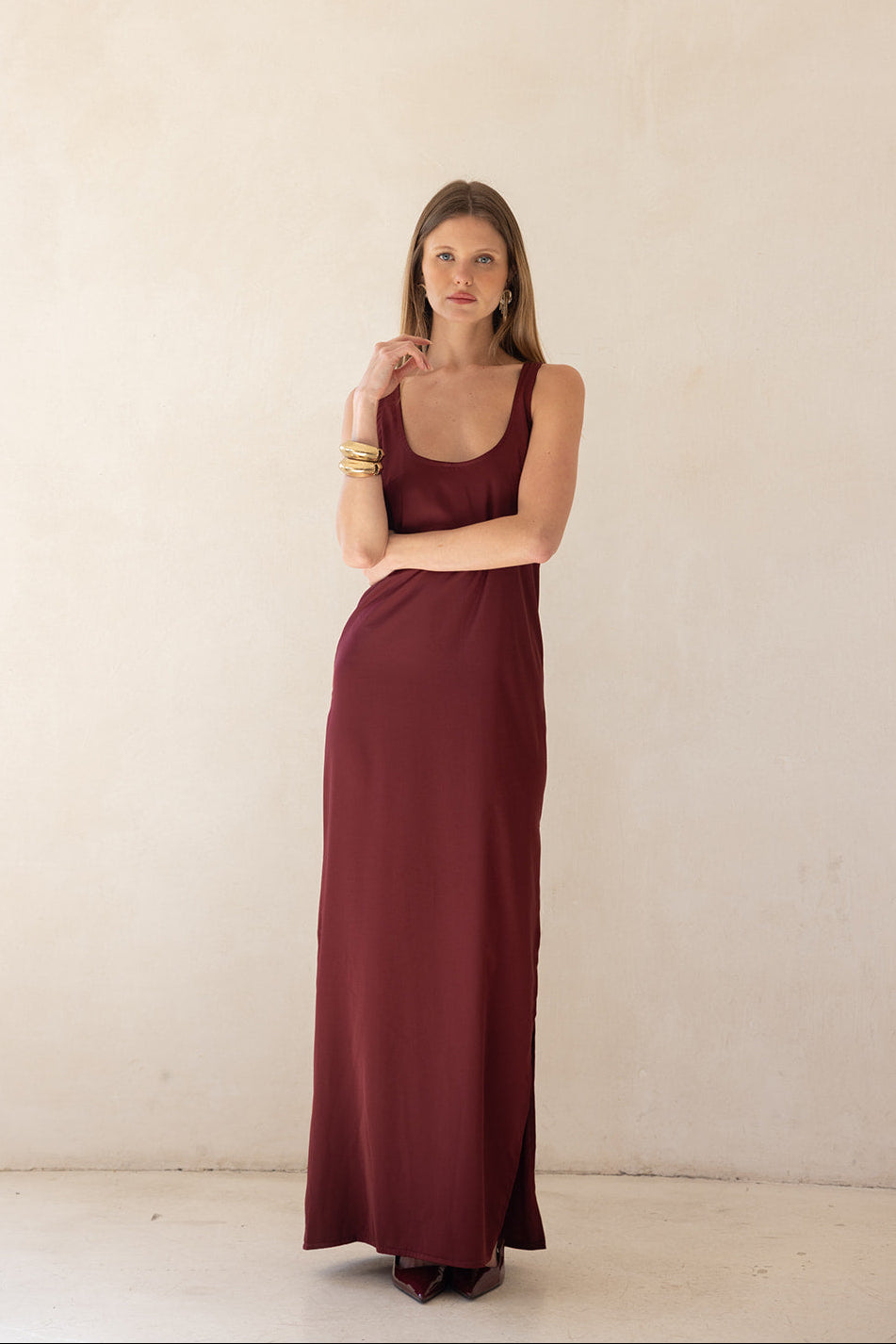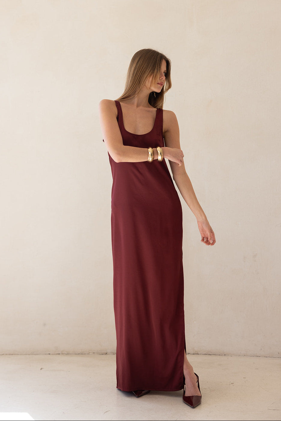 שמלת מקסי שחורה בגזרה ישרה ונינוחה, בעלת מפתח עגול עמוק וכתפיות רחבות, המעניקה מראה מינימליסטי, אצילי ועל-זמני. מבד איכותי, נשפך ורך במיוחד, המונח על הגוף בקלילות ומשדר אלגנטיות בלתי מתאמצת.