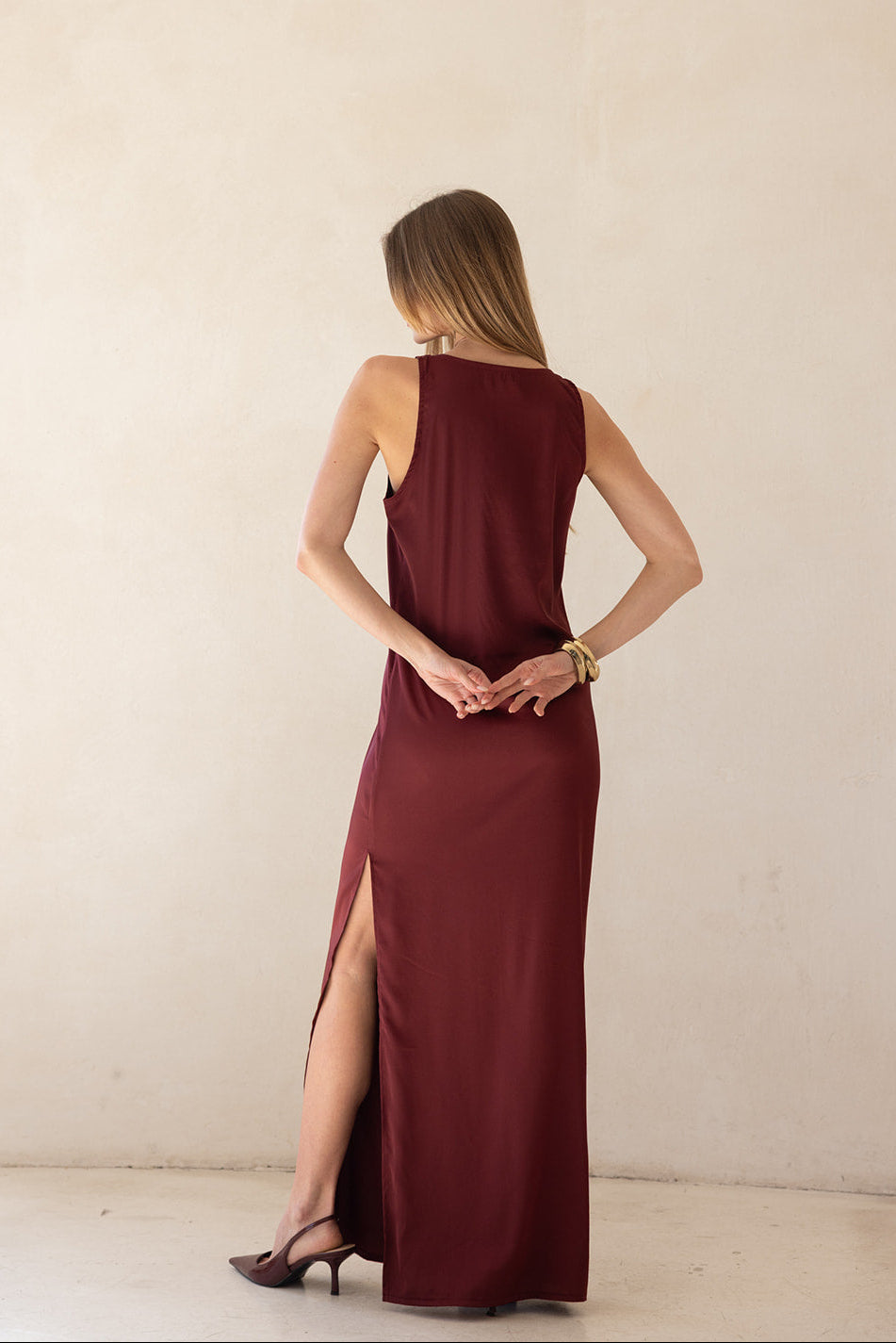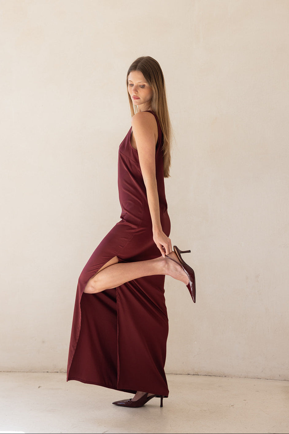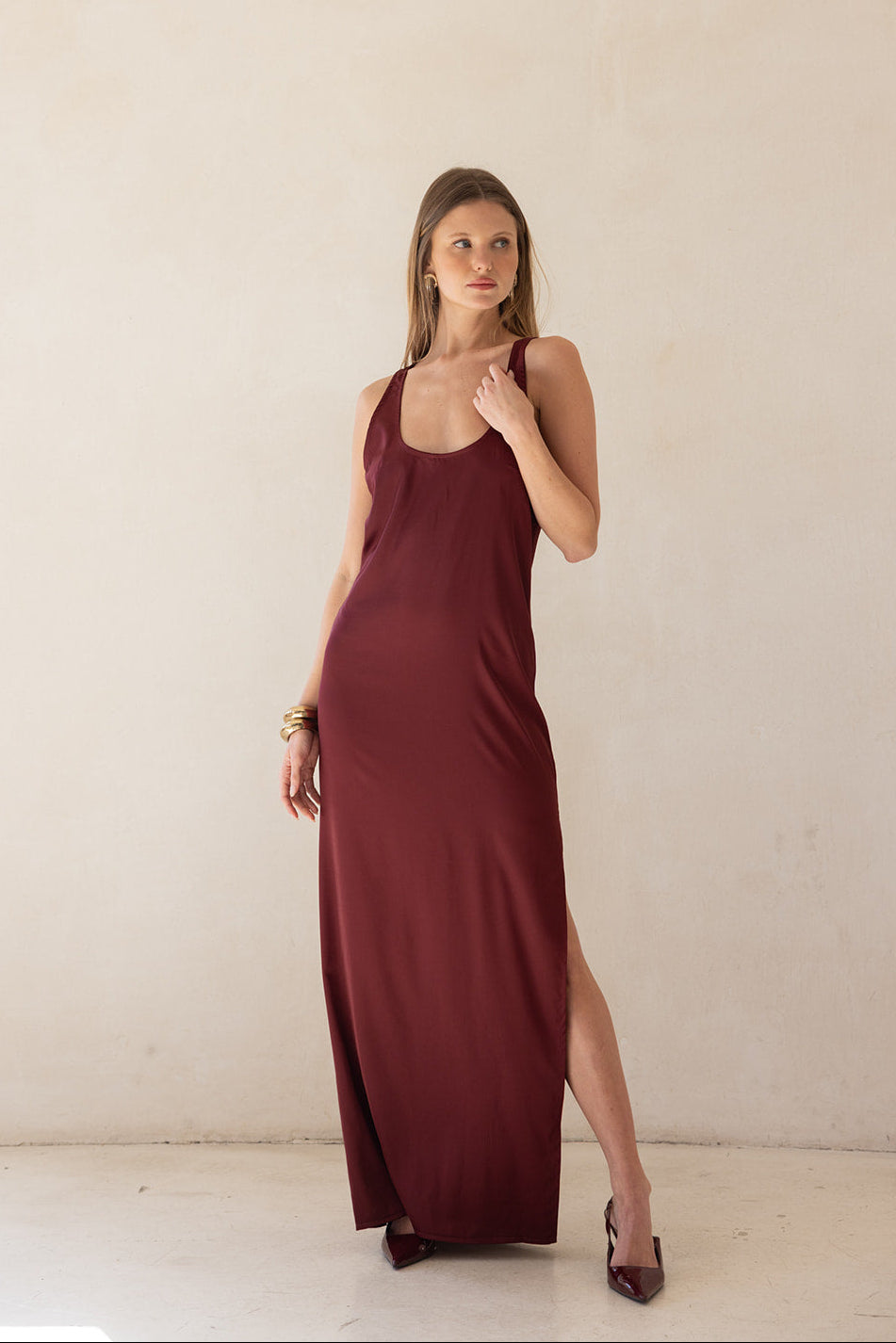 שמלת מקסי שחורה בגזרה ישרה ונינוחה, בעלת מפתח עגול עמוק וכתפיות רחבות, המעניקה מראה מינימליסטי, אצילי ועל-זמני. מבד איכותי, נשפך ורך במיוחד, המונח על הגוף בקלילות ומשדר אלגנטיות בלתי מתאמצת.