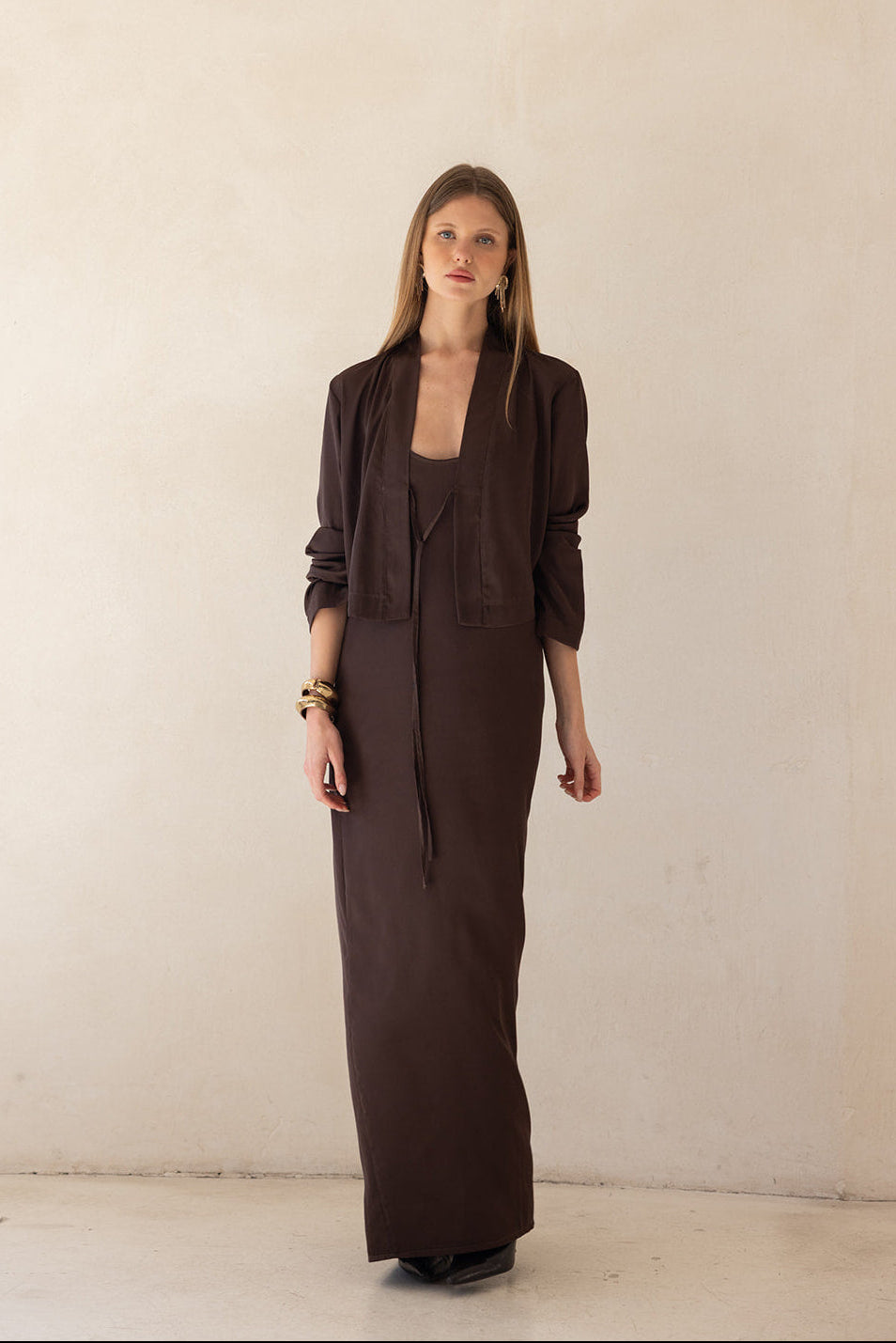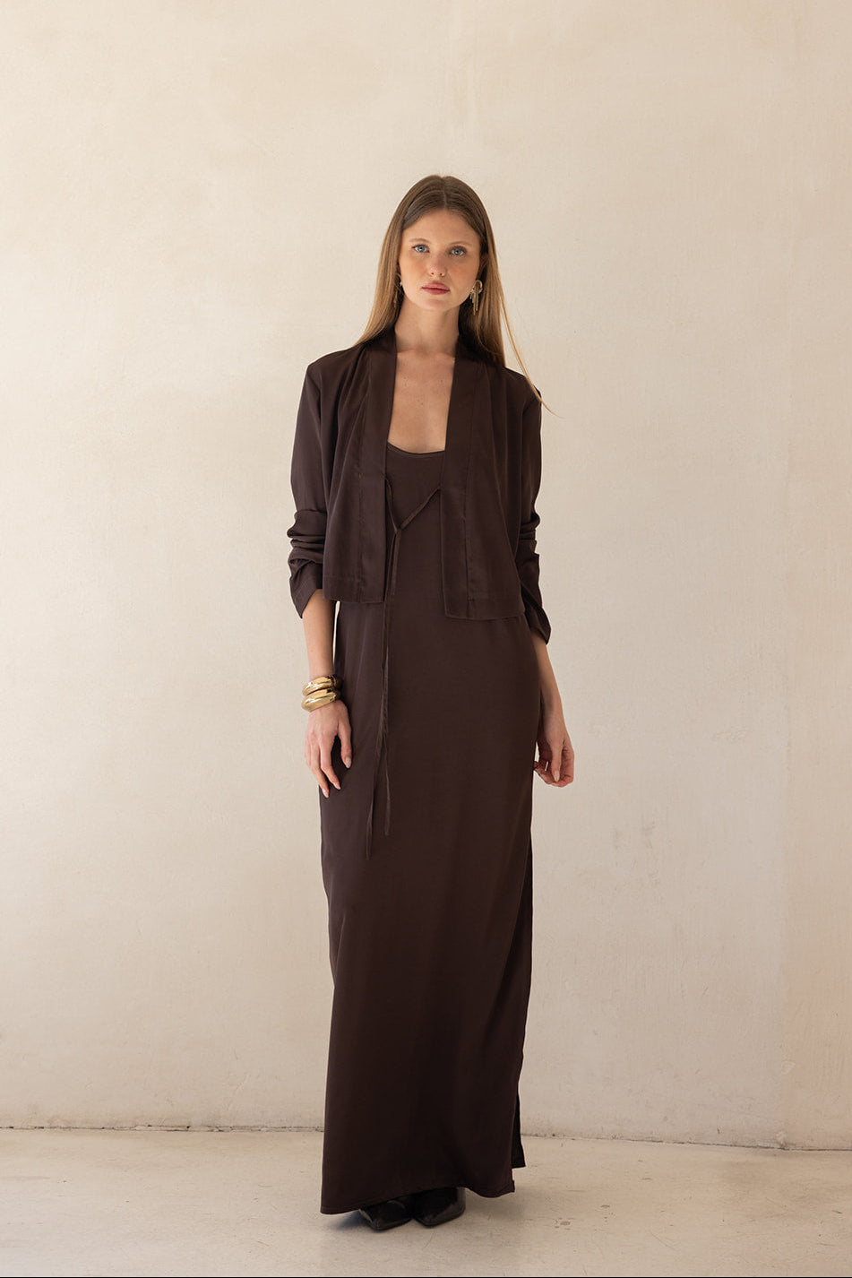 ג'קט קרופ ערב בגזרה פתוחה ומשוחררת עם שרוולים ארוכים וצווארון דש רחב, המעניק מראה שכבות מתוחכם וגימור נקי. מבד איכותי, רך ונשפך, בעל מגע מלטף.