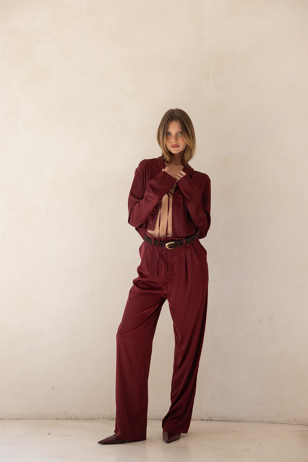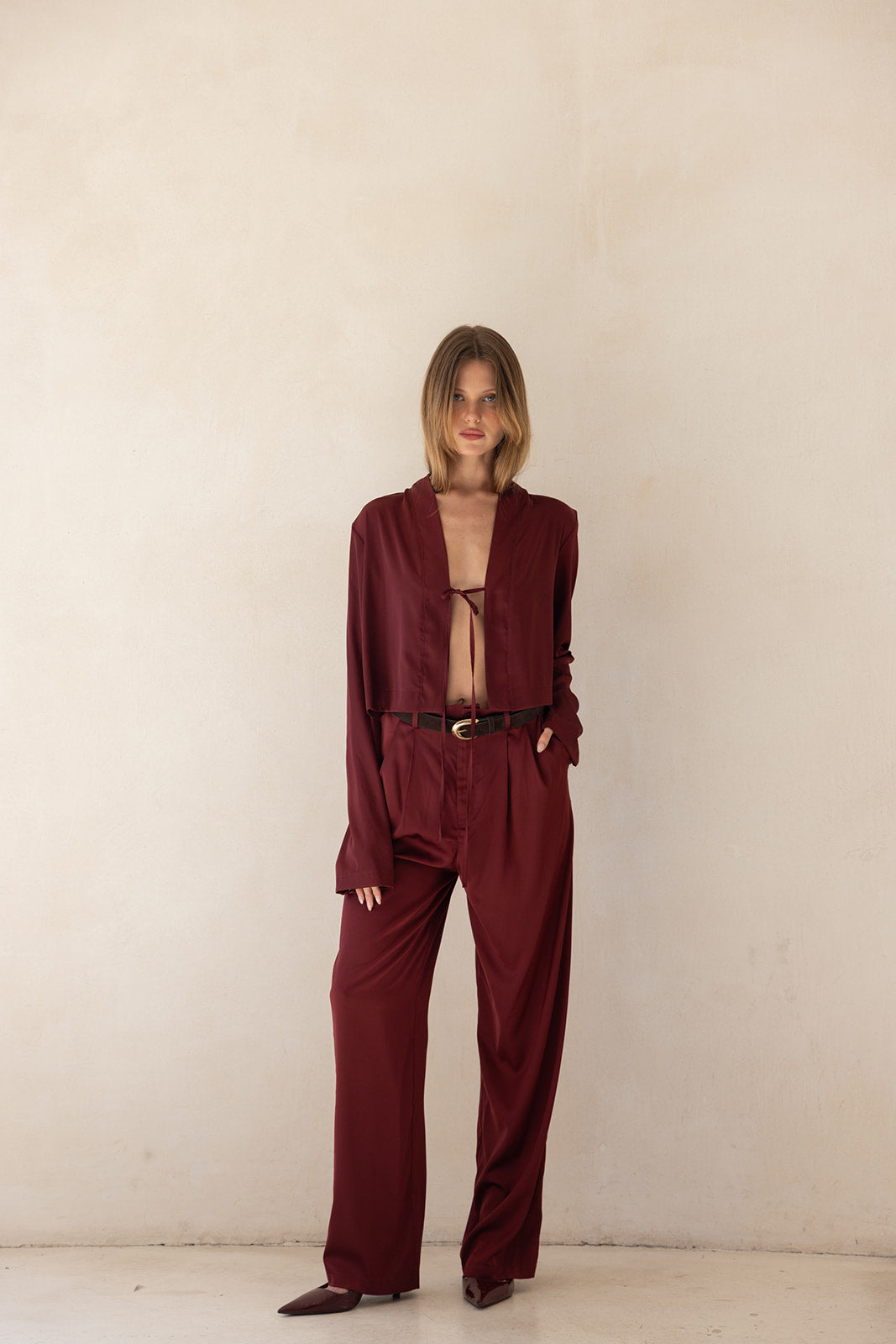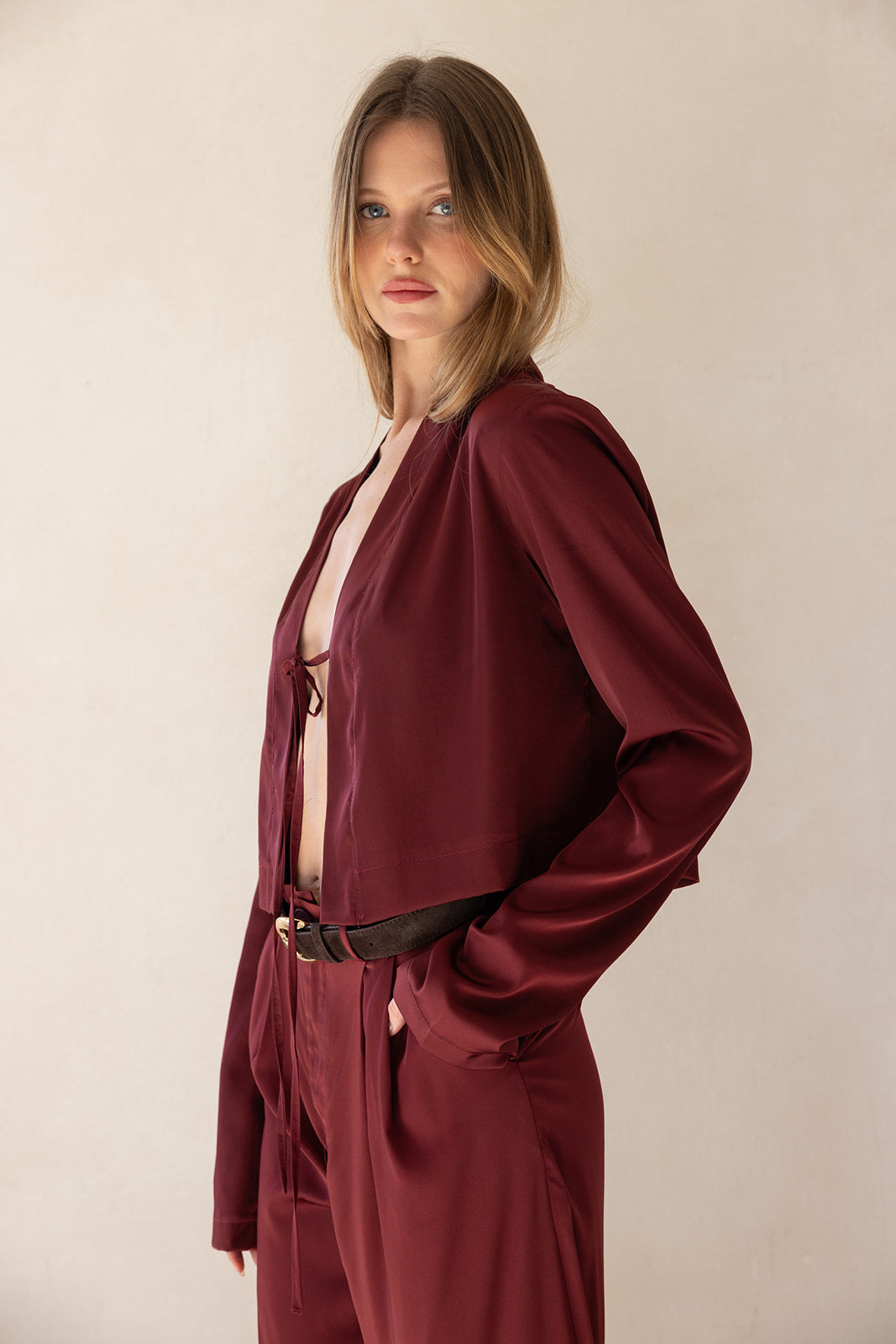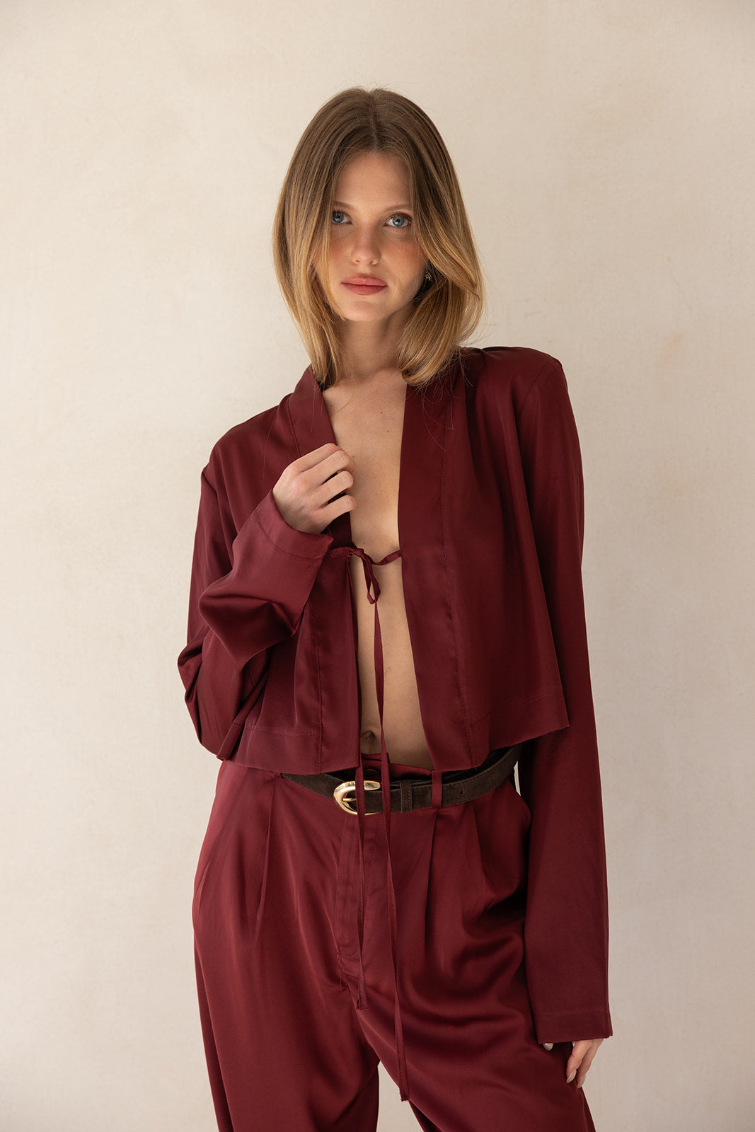 ג'קט קרופ ערב בגזרה פתוחה ומשוחררת עם שרוולים ארוכים וצווארון דש רחב, המעניק מראה שכבות מתוחכם וגימור נקי. מבד איכותי, רך ונשפך, בעל מגע מלטף.