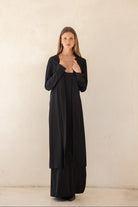 ג׳קט מקסי ארוך בגזרה פתוחה ונשפכת, בעל קווים נקיים ושרוולים ארוכים למראה שכבות אלגנטי. מבד רך ונעים למגע, בעל ברק עדין ותנועתיות יוקרתית.