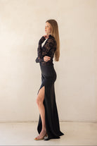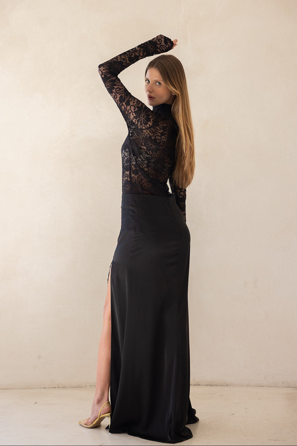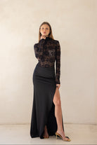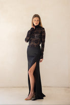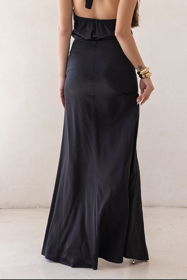 חצאית לערב באורך מקסי עשירה בבד ועם שסע עמוק בצד הרגל למראה דרמטי ונשי.