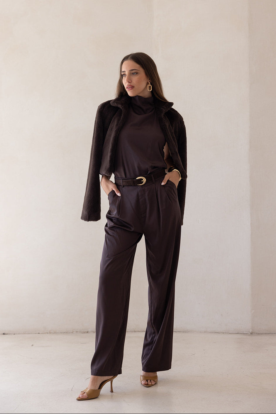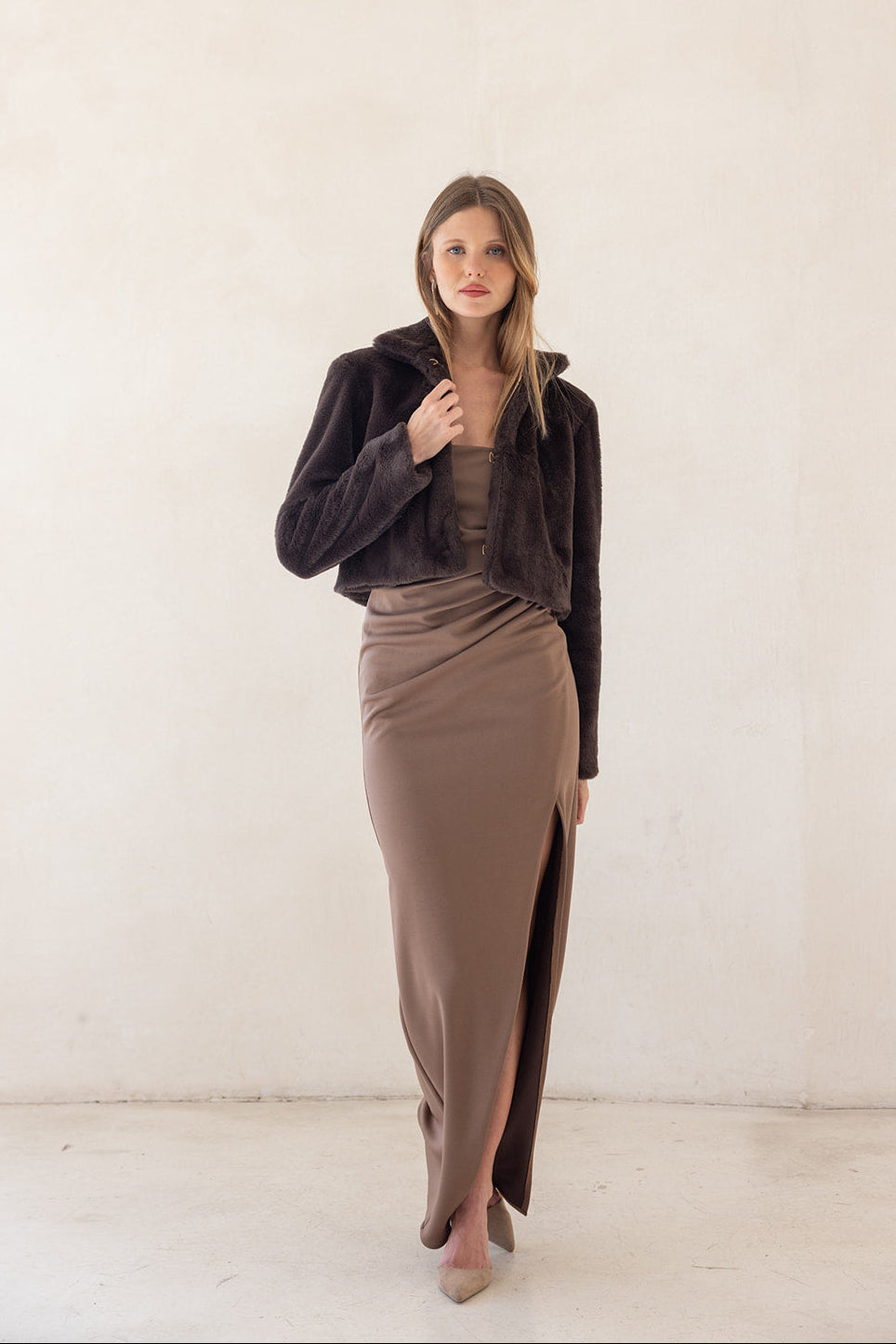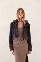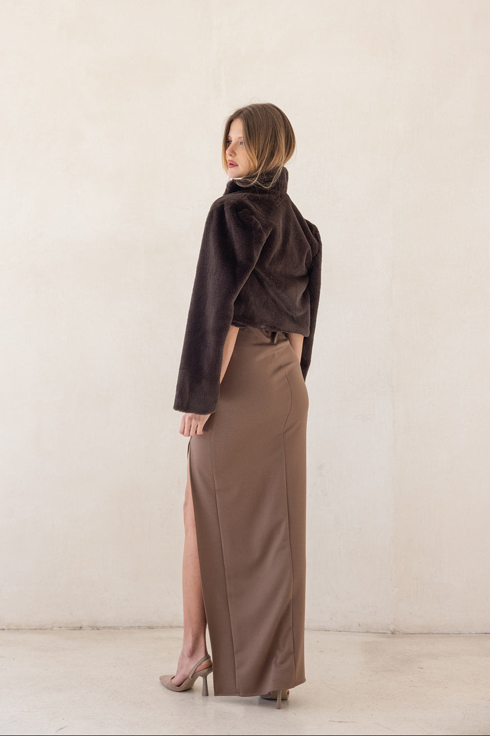 מעיל קרופ בגזרת צווארון קלאסית, עם סגירה נסתרת בחזית.