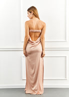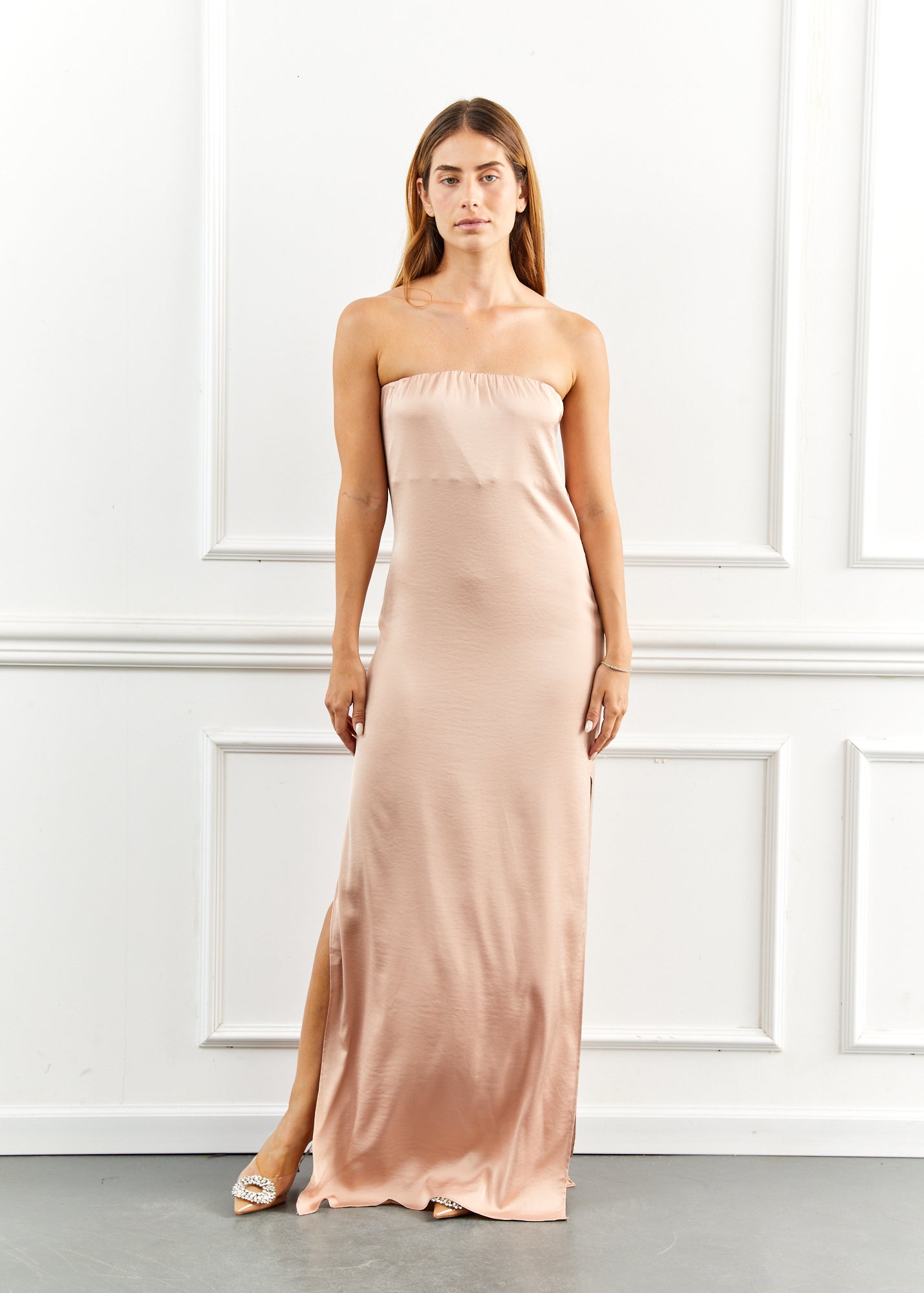 שמלת סטרפלס מקסי מבד סאטן מבריק ומרשים, שני שסעים בצדדים, פס כיווצים ורבידה עמוקה בגב. מידה XS מתאים למידות 32 מידה S מתאים למידות 34 מידה M מתאים למידות 36